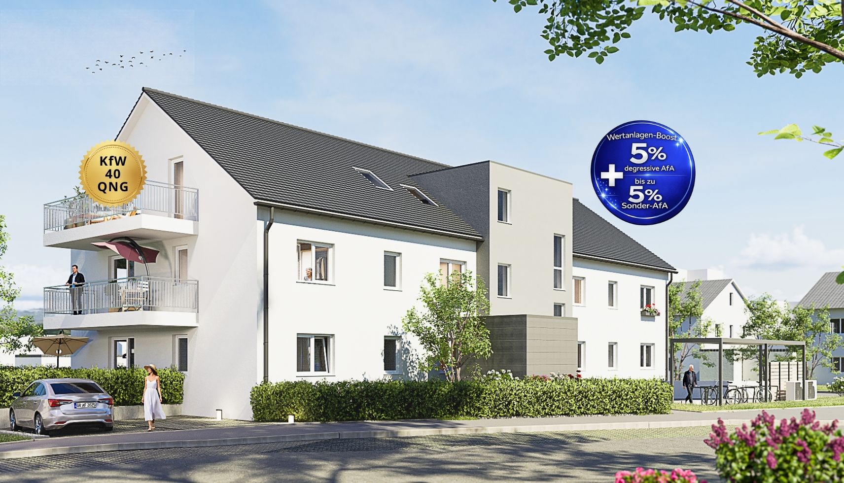 Die Architektur ist zeitlos und zurückhaltend – bewusst klar und modern gestaltet. Eine hochwertige Fassadengestaltung, große Fensterflächen und durchdachte Grundrisse sorgen für ein stimmiges Gesamtbild. Weniger auffällig, dafür langlebig und wertbeständigpassend zur Umgebung und zur Zielsetzung: Nachhaltig Werte schaffen.